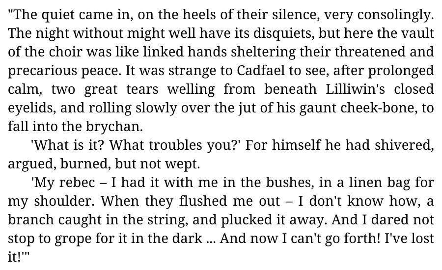 Last year I decided to make my way through every book in Ellis Peters’ Cadfael series, since they’re short, conventionally plotted, and full of period detail, being set in 12th century Shrewsbury. One particular passage in the seventh novel, The Sanctuary Sparrow, rather unaccountably moved me more than anything I’ve read in fiction in the last few years. A penniless bard, Lilliwin, is chased and beaten by a mob after he is falsely accused of murder. Finding temporary safety in the abbey, he’s nursed by Brother Cadfael, the abbey herbalist: